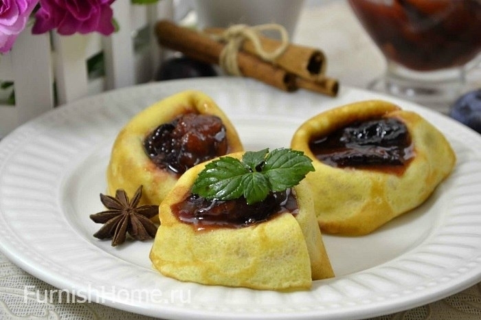 Для оригинальной подачи блинчиков со сливовым соусом предлагаю использовать блинные корзинки.
