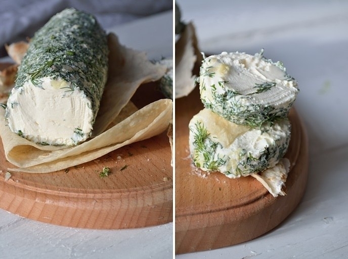 Через 2 дня накрошить свежего укропа, порубить мелко чеснока и еще хорошую щепотку соли. И обвалять сыр в этой смеси, сформовав сырный батончик.