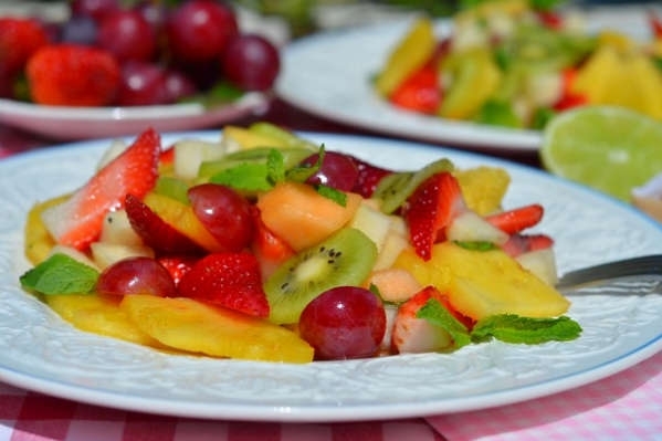 Рецепт хорош тем, что все фрукты взаимозаменяемы; например, сюда смело можно добавить грейпфрут, апельсин, персики или мандарины, а чтобы салат был более питательный, в самом конце можно добавить банан.