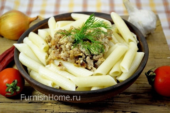 Тем временем и макароны наши готовы – мы сливаем с них всю воду, приправляем сливочным маслом и выкладываем на тарелочку. Сверху в центре определяем обжаренный с лучком фарш. Перед употреблением блюда нужно все перемешать.