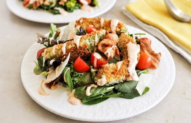 Салат с хрустящим авокадо и беконом, заправленный кисло-сладким дрессингом и острым соусом — пикантное и согревающее блюдо. Для тех, кто любит погорячее