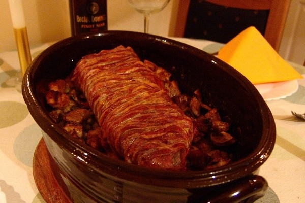 Нежная запеченная говядина с овощами и беконом. Богатый вкус — сытное блюдо.