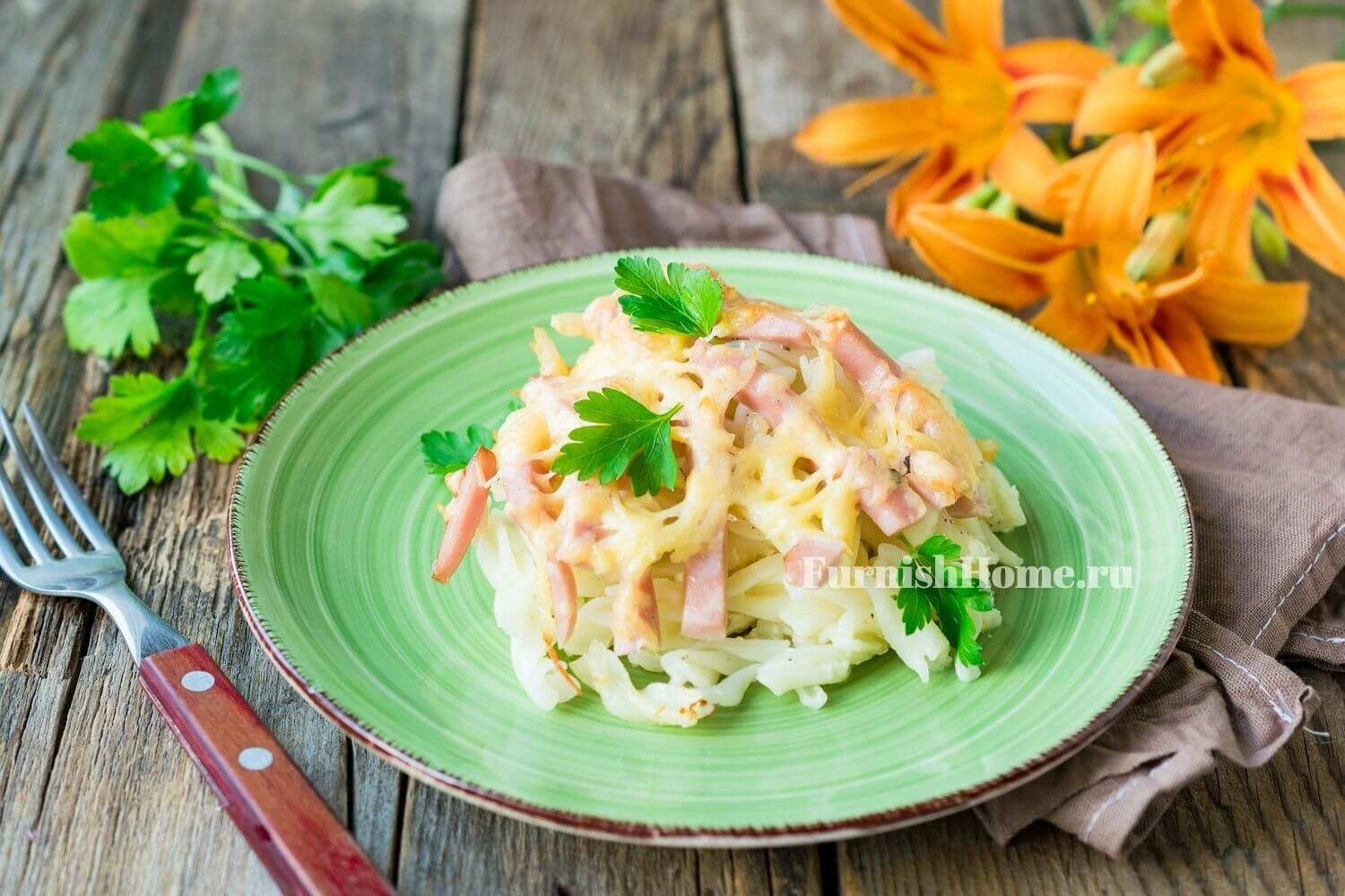 Вареную колбасу очистим от оболочки, порежем соломкой, выложим поверх макаронных изделий.